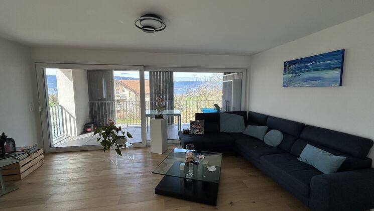 Grâce à ses nombreuses ouvertures ainsi qu'à son balcon, l'appartement est lumineux et permet de profiter d’une vue sur le massif du Jura et le lac.